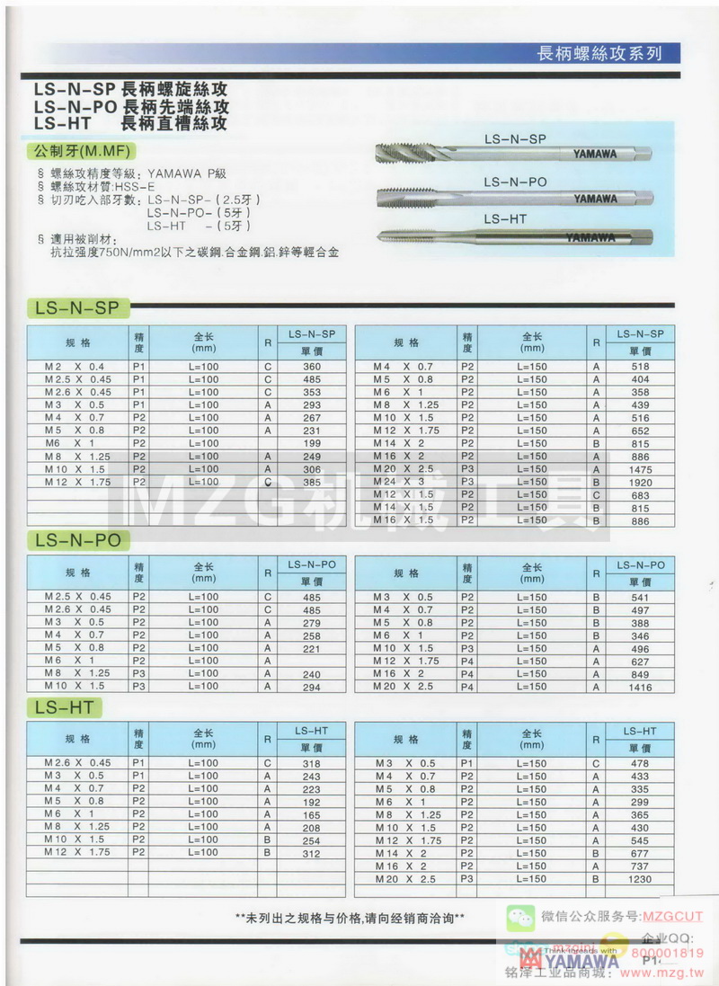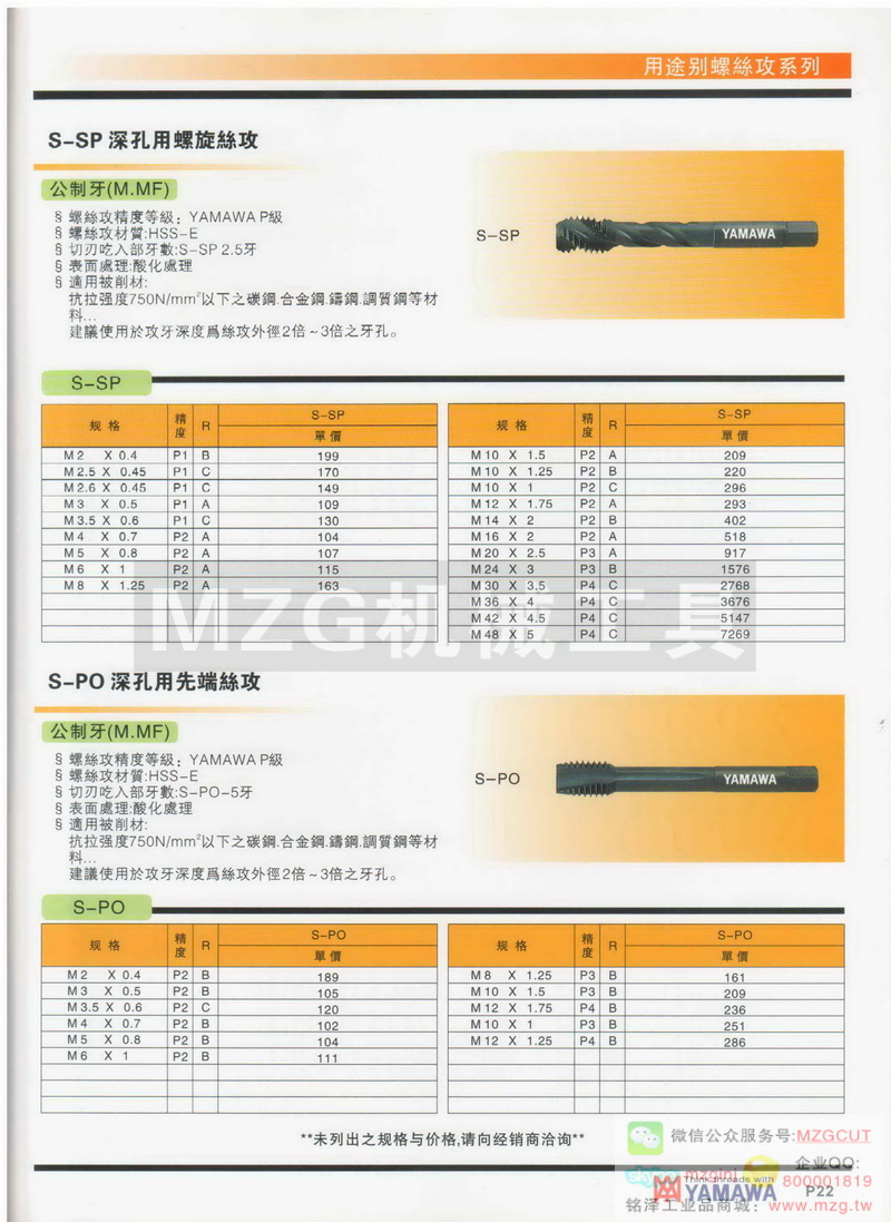 YAMAWA先端直槽絲攻產(chǎn)品技術(shù)參數(shù)配件組成信息